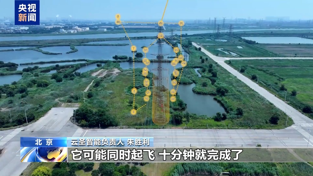 云圣智能负责人朱胜利:我们把无人机实现“机、网、云”一体化,数据实时回传、实时处理、实时存储,整个过程变得非常高效,整个集群进行作业,效率更高。比如巡检整个1000公里的输电线路,它可能同时起飞,十分钟就完成了。